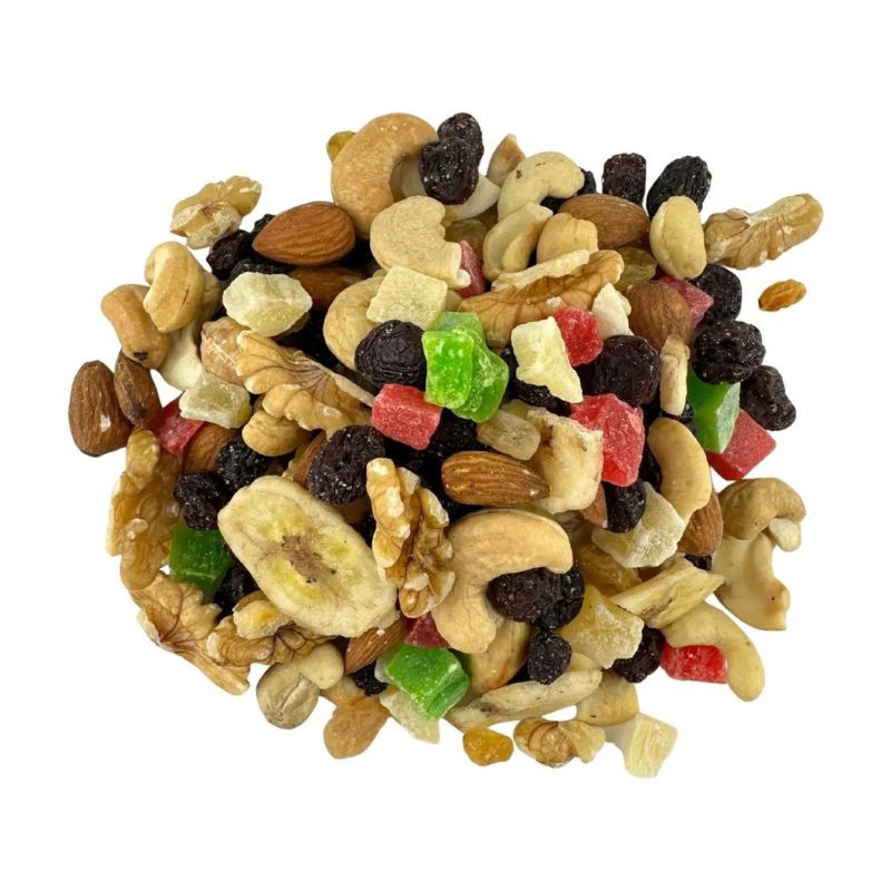 (Almendras, nueces mariposa, chips de banana, maní, pasas de uva negras y blancas, fruta abrillantada)